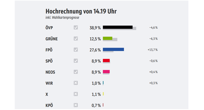 Wahl Vbg. Ochrechn. 14.19 Ähnliche Beiträge:Wahl Vbg. Ochrechn. 14.19Wahl Vbg. Hochrechn. 14.19Österreich Wahl KicklWahl 2024 2Demo wien Wahl 24.09.2024 Beitrags-Navigation Wahl Vorarlberg – Hochrechnung: Verluste für ÖVP & Grüne – starke FPÖ-Gewinne