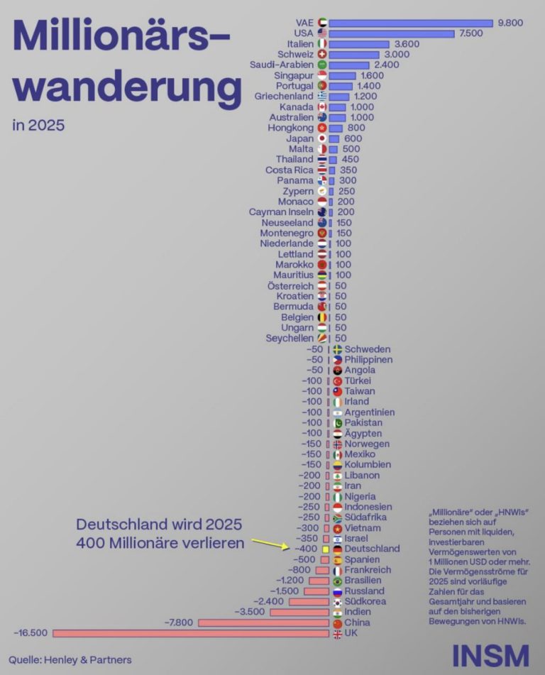 Zgodnie z aktualnym badaniem, w roku 2025 Niemcy opuści aż 400 milionerów. I to dopiero początek, ponieważ łącznie przewiduje się migrację od 200 000 do 250 000 Niemców. Lekarze, inżynierowie, naukowcy, przedsiębiorcy – wszyscy odwracają się od swojej ojczyzny, ponieważ warunki życia z roku na rok się pogarszają.