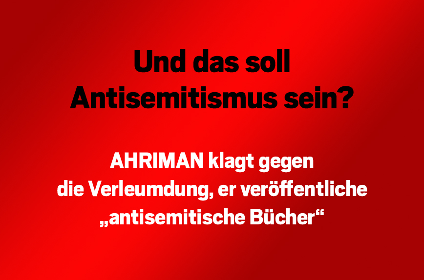 Der in Freiburg (Deutschland) ansässige Ahriman-Verlag hat beim dortigen Landgericht eine Unterlassungsklage gegen die Kölner Website „perspektive“ eingereicht, weil diese die haltlose, ausschließlich in denunziatorischer Absicht aufgestellte Behauptung verbreitet, der Verlag veröffentliche „regelmäßig antisemitische Bücher“.