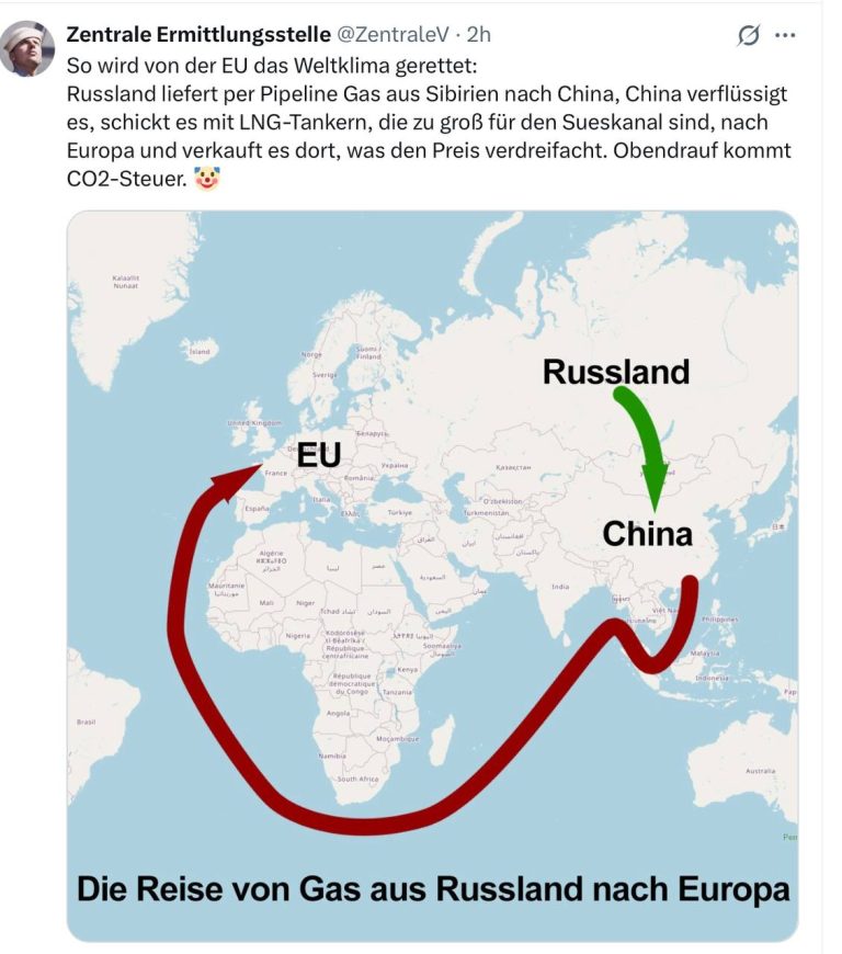 Rosja dostarcza gaz z Syberii do Chin rurociągiem, Chiny go skraplają, wysyłają w tankowcach LNG, które są za duże dla Kanału Sueskiego, do Europy i sprzedają tam, co potraja cenę. Na to nakłada się podatek od CO2.