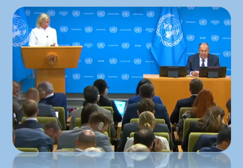Nach seiner Rede im Plenarsaal der Generalversammlung der Vereinten Nationen, kurz UN-Vollversammlung (englisch: United Nations General Assembly – UNGA) stellte sich der russische Außenminister Sergey Lawrow auf einer Pressekonferenz den Fragen internationaler Journalisten.