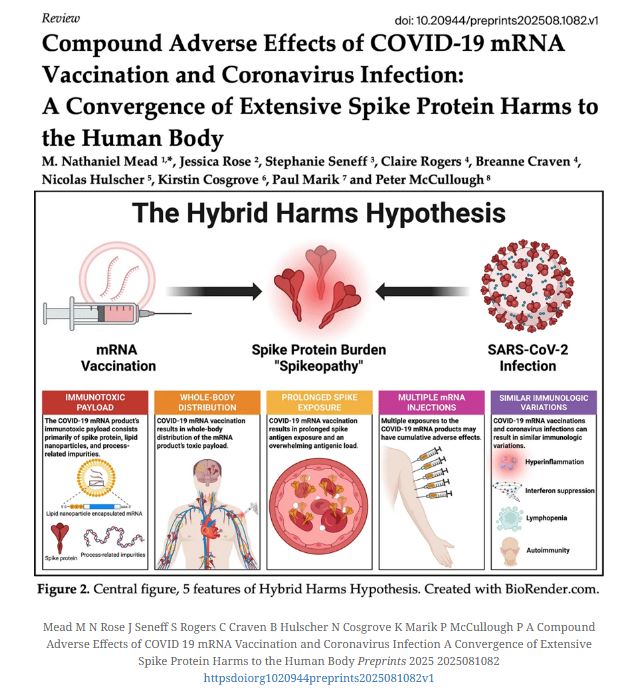 To obszerne dzieło – autorstwa M. Nathaniela Meada, MSc, PhD; Jessiki Rose, MSc, PhD; Stephanie Seneff, MSc, PhD; Claire Rogers, MSPAS, PA-C; Breanne Craven, PA-C; Nicoli Hulscher, MPH; Kirstin Cosgrove, BM, CCRA; Paula Marika, MD; oraz Petera McCullougha, MD, MPH – opisuje, jak infekcje koronawirusa negatywnie wpływają na skutki wcześniejszych szczepień mRNA przez lata, co prowadzi do trwałego globalnego kryzysu zdrowotnego, charakteryzującego się przewlekłymi chorobami, nagłymi zgonami i utrzymującą się wysoką śmiertelnością. Mead M N, Rose J, Seneff S, Rogers C, Craven B, Hulscher N, Cosgrove K, Marik P, McCullough P. Złożone działanie niepożądane szczepienia mRNA COVID-19 i infekcji koronawirusem. Zbieżność rozległych uszkodzeń białka kolca dla ludzkiego ciała.