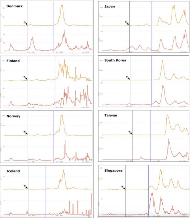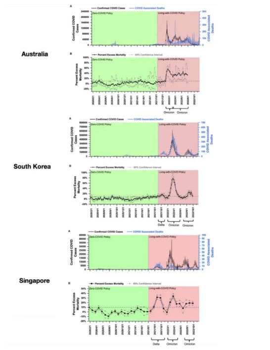 Wszystkie osiem krajów przedstawionych na rysunku 1 zaczęło znacząco odnotowywać wzrost liczby przypadków i zgonów dopiero po tym, jak 75% populacji było w pełni zaszczepione – podczas łagodnej ery Omikron. Obszernie prowadzone badania zgodnie pokazują, że ochrona ze szczepionek mRNA słabnie w ciągu kilku miesięcy, a potem zmienia się w negatywną skuteczność, przy czym większa liczba dawek oznacza wyższe ryzyko infekcji. Analiza 145 krajów wykazała, że programy szczepień były związane z nawet 291% większą liczbą przypadków i 205% większą liczbą zgonów niż przewidywano bez nich. Te wzorce sugerują, że masowe szczepienie mRNA jest głównym czynnikiem wywołującym fale Covid-19 po ich wprowadzeniu.