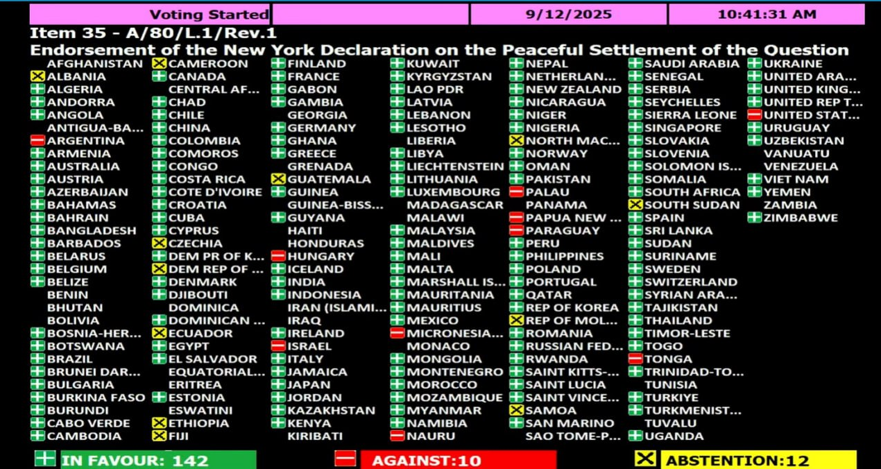 W piątek w Zgromadzeniu Ogólnym Narodów Zjednoczonych rozległy się brawa, gdy kraje przyjęły oświadczenie dotyczące pokojowego załatwienia kwestii palestyńskiej oraz wdrożenia rozwiązania dwupaństwowego z Izraelem, uzyskując dużą większość.