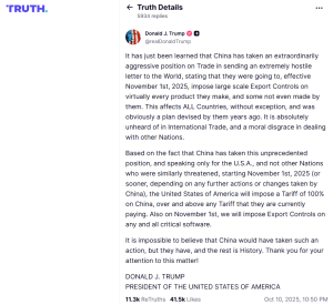 Aufgrund der Tatsache, dass China diese beispiellose Position vertritt, werden die Vereinigten Staaten von Amerika, die nur für sich, doch nicht für andere ähnlich bedrohte Nationen sprechen, ab dem 1. November 2025 (oder früher, abhängig von weiteren Maßnahmen oder Änderungen seitens Chinas) einen Tarif von 100% auf [Produkte aus] China verhängen, zusätzlich zu den Tarifen, die sie derzeit zahlen. Gleichermaßen werden wir am 1. November Exportkontrollen für alle kritischen Softwareprodukte erheben.