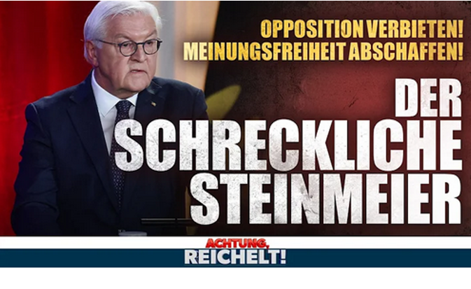 JULIAN REICHELT | Es ist eine neue Folge „Achtung, Reichelt!“ online. Diesmal geht es um: Steinmeiers Horror-Rede: Opposition verbieten, Meinungsfreiheit abschaffen Steinmeier fordert offen das Ende der Opposition: Wer nicht der Regierung folgt, wird aus der Demokratie ausgeschlossen. Resozialisierung möglich? Nur, wenn man der Herrschenden Gesinnung folgt.