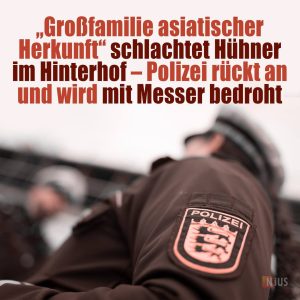 In Bad Säckigen hat die Polizei sieben Personen einer „Großfamilie asiatischer Herkunft“ festgenommen, die im Hinterhof mehrere Hühner geschlachtet haben. Es kam zu tumultartigen Szenen. Acht Hühner konnten nicht mehr gerettet werden. (…)