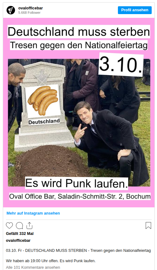 Na plakacie dotyczącym wydarzenia stowarzyszenie pokazało mężczyznę, który śmiejąc się pozuje obok nagrobka z napisem „Niemcy”. Na nim widnieje zdjęcie z kiełbasami. Powyżej napisano dużymi literami „Niemcy muszą umrzeć – bar przeciwko świętu narodowemu”, a poniżej znajduje się informacja „Będzie grał punk”.