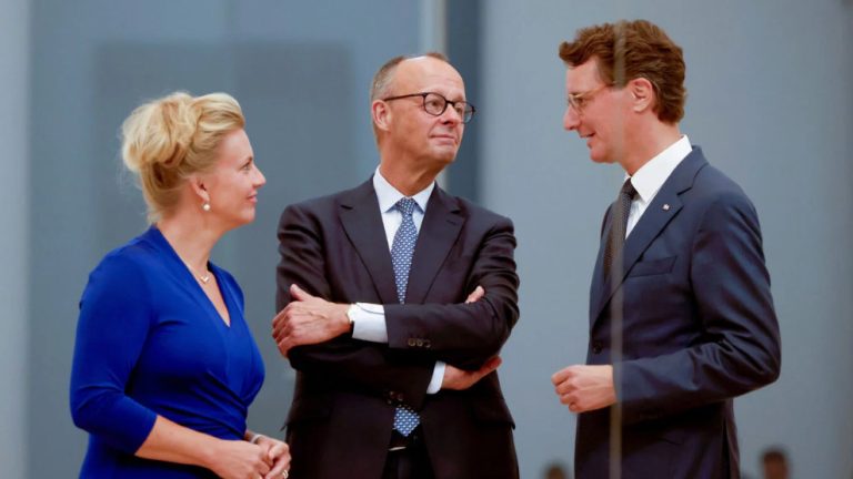 Kanclerz federalny Friedrich Merz między premierem Nadrenii Północnej-Westfalii Hendrikiem Wüstem (prawo) a ministrem kultury Iną Brandes (wszystko CDU, lewo): wsparcie dla antyniemieckiego stowarzyszenia.