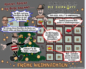 Die ersten beiden Cartoons sind nicht nur den Fans von Herbert Kickl die NGO betreffend [1] und dem Ende des Klimawahns gewidmet, sondern auch allen empörten Bürgern in Deutschland, die in der Kürzung unnötiger Zahlungen an diverse NGOs und einem Ende der „Energiewende“ein enormes Sparpotenzial erblicken. . . . Viel Spaß wünschen UNSER MITTELEUROPA und Don Tomasino.