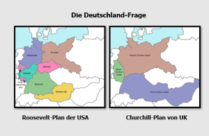 Roosevelt befürwortete die Aufteilung Deutschlands in die Staaten Preußen, Hannover, Hessen, Sachsen, Bayern sowie eine internationale Zone (Ruhr und Saar). Churchill hingegen schwebte die Schaffung einer Donau-Republik, die einen Teil der deutschen Gebiete umfassen sollte, vor und war für die Zerstörung Preußens.