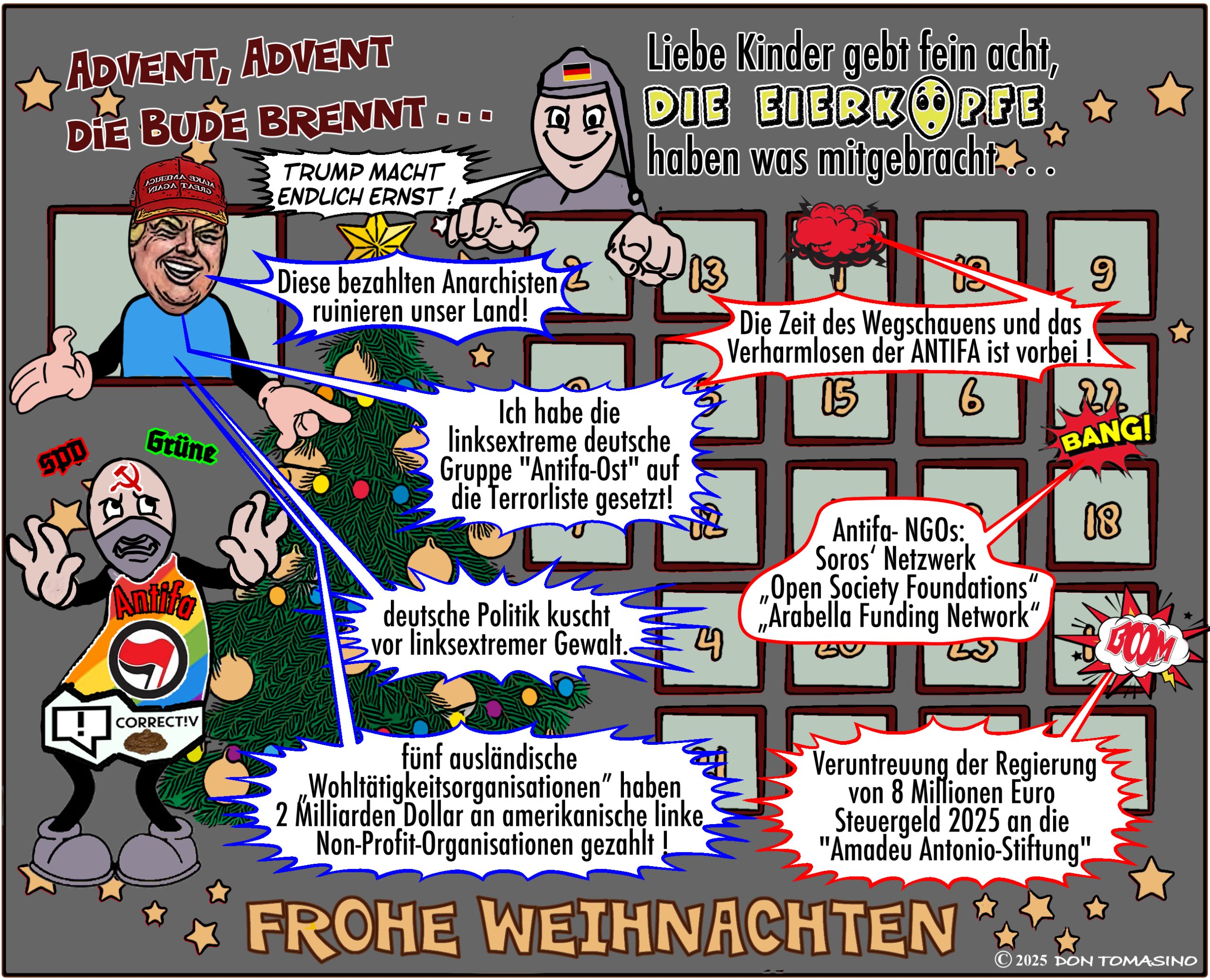 Für UNSER MITTELEUROPA hat unser Karikaturist Don Tomasino zum Jahresende wieder den Versuch unternommen, den Wahnsinn, der uns umgibt aber nie durchdringen darf, auf ein erträgliches Maß und zu reduzieren und den Irrsinn der da abläuft in die Ecke zu befördern, wo er hingehört!