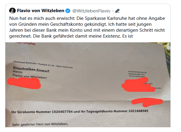 To, że na Grundgesetz [1] można machać ręką, gdy chodzi o rzekomo „dobrą sprawę” – w tym przypadku „walkę z prawicą” – jest powszechnie znane. I całkowicie w tym duchu, dziennikarz Flavio von Witzleben [2] otrzymał teraz wypowiedzenie umowy o konto w jednej z kas oszczędnościowych.