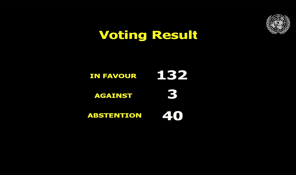 5.12.2025: 132 kraje są za, trzy przeciw, a dodatkowo 40 „wstrzymujących się” | Źródło: Media ONZ – Zrzut ekranu