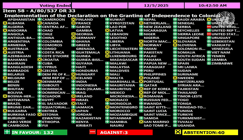 5 grudnia 2025 roku Zgromadzenie Ogólne ONZ głosowało pod punktem 58 nad „Wdrażaniem rezolucji dotyczącej niepodległości krajów i narodów kolonialnych”: