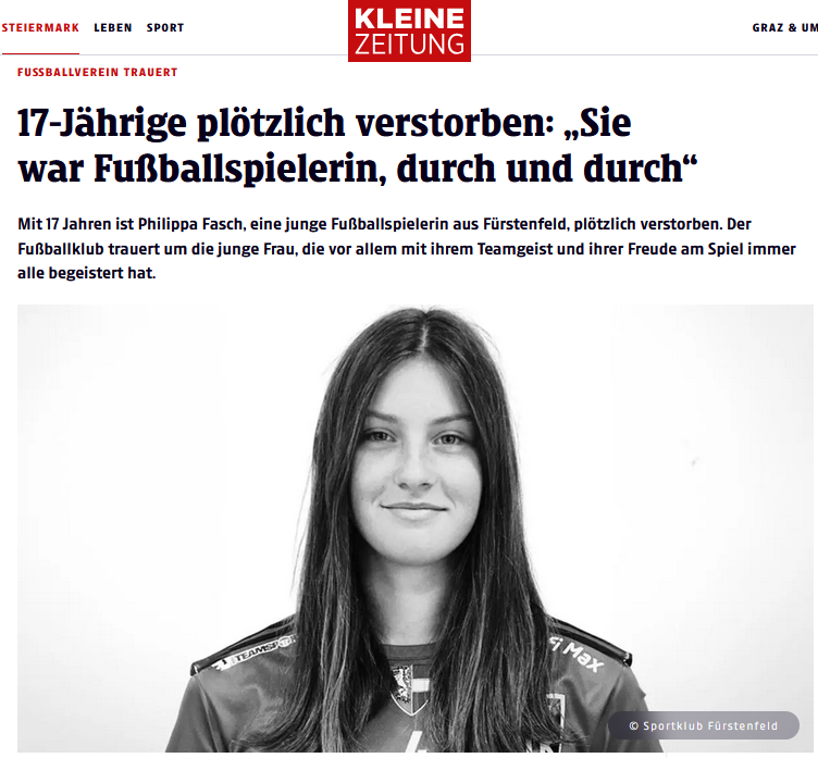 „Całkowicie wstrząśnięci i głęboko poruszeni, otrzymaliśmy wiadomość o nagłym odejściu naszej zawodniczki Philippy Fasch”, pisze klub sportowy Fürstenfeld w publicznym oświadczeniu w mediach społecznościowych. 17-letnia zawodniczka z Oststeiermark była częścią klubu od 2014 roku i „była czymś więcej niż tylko zawodniczką – była prawdziwą przyjaciółką”.
