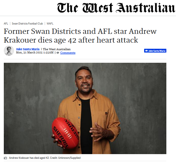 Były gwiazdor Swan Districts i AFL Andrew Krakouer (†42) nagle i niespodziewanie umiera na zawał serca.