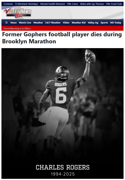 Były futbolista Charles Rogers nagle i niespodziewanie mdleje podczas maratonu w Brooklynie i umiera w wieku 31 lat. Rzecznik drużyny Gophers powiedział w oświadczeniu: „Charles był wspaniałym młodym człowiekiem, który miał zaraźliwy uśmiech i charyzmatyczną osobowość. Pozostaniemy w myślach z jego rodziną i przyjaciółmi, którzy opłakują tę tragiczną stratę.”