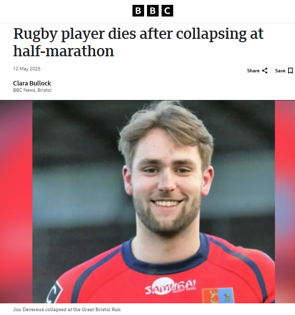 28-letni rugbyzysta zmarł po załamaniu na półmaratonie. Jon Devereux z Chester brał udział w Great Bristol Run, gdy w dniu 11 maja zemdlał i musiał otrzymać pomoc medyczną. Później zmarł w szpitalu, jak potwierdziła firma Great Bristol Run. Przyczyna śmierci zostanie ustalona po badaniach medycznych.