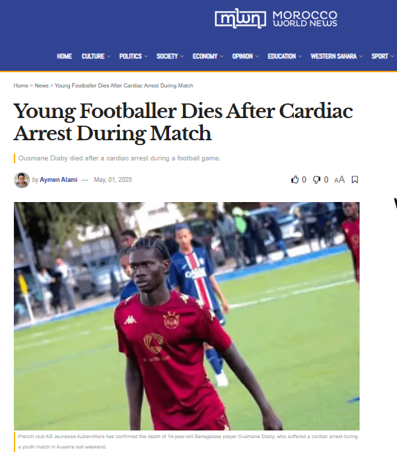 Ousmane Diaby, zaledwie 14-letni talent piłkarski, doznał zatrzymania akcji serca podczas meczu i zmarł mimo natychmiastowej pomocy medycznej.