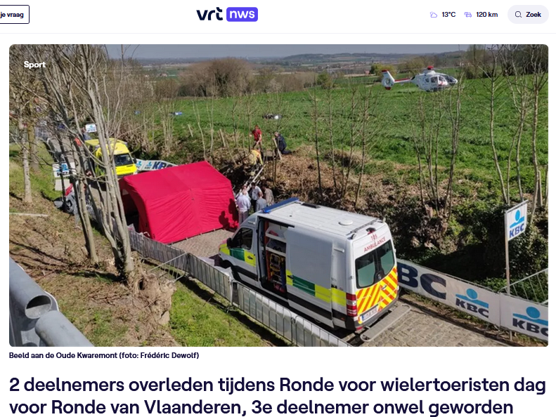 Podczas „We Ride Flanders”, wyścigu dla amatorów kolarstwa dzień przed Rundą Flandryjską, zmarło dwóch uczestników. Trzeci przeżył. Potwierdzili to organizatorzy.