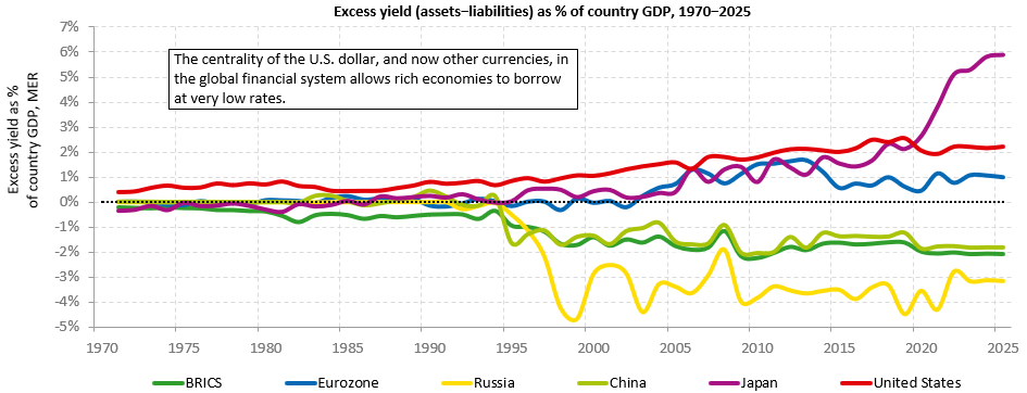 Dodatnie wartości oznaczają wzrost dochodów z powodu finansowych przywilejów beneficjentów: Japonia, USA, UE. Wartości ujemne oznaczają obciążenia finansowe, jak w przypadku BRICS z Brazylią, Rosją, Indiami, Chinami i RPA | Źródło: Nievas i Sodano (2025) oraz wir2026.wid.world/methodology