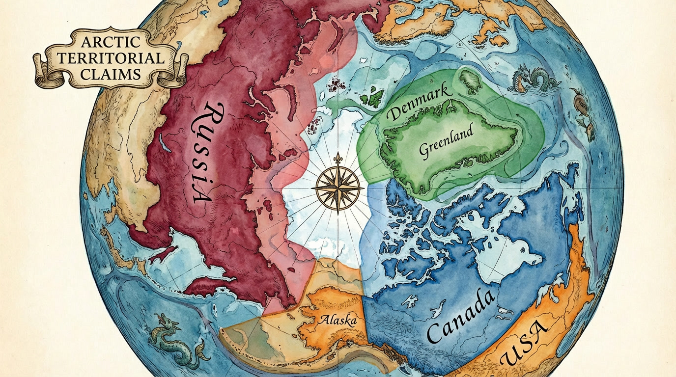 Fast alle arktischen Anrainerstaaten haben in Bezug auf die Erweiterung des Kontinentalsockels [das sogenannten ECS – Extended Continental Shelf] über die 200-Meilen-Zone hinaus, Einigungen erzielt, sodass nur noch ein kleines „Flächenstück” in der Mitte, rund um den Nordpol – siehe Titelbild, eingezeichnet in Weiß – noch frei blieb. Doch selbst dieser Fleck ist umstritten, weil er überlappend von mehreren Staaten zugleich beansprucht wird.