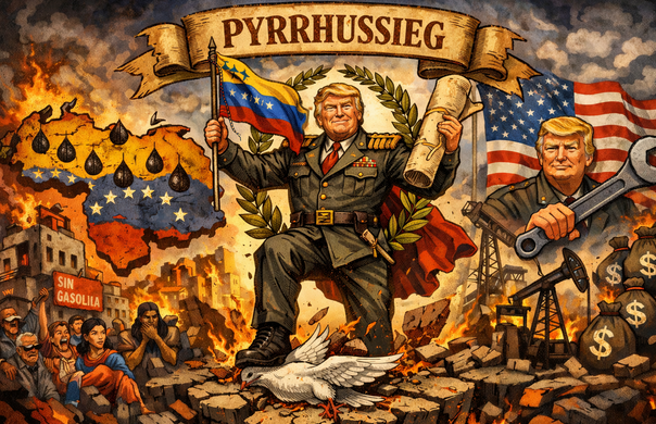 Die USA ist wegen ihrer Überschuldung außer Stande noch einen Großkrieg mit hunderten Milliarden, oder sogar Billionen Kosten zu führen. Aus genau diesem Grund ist Trump auch aus dem Ukrainekrieg ausgestiegen. Jetzt hofft Trump durch die Entführung Maduros Venezuela auf einen proamerikanischen Kurs zu bringen, nachdem dieses Land jahrelang durch Sanktionen wirtschaftlich stranguliert wurde. Eine derartige Vorstellung ist jedoch naiv und kindisch. Glaubt Donald Trump ernsthaft, dass man ein ganzes Land durch die Entführung seines Präsidenten erpressen kann? Das politische System Maduros bleibt intakt und ist nur durch Drohungen nicht zu ändern.