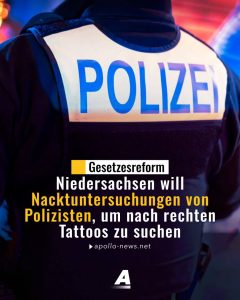 Die rot-grüne Landesregierung in Niedersachsen will das polizeiliche Disziplinarrecht ändern, um bei Verdacht auf Rechtsextremismus amtsärztliche Nacktuntersuchungen von Polizisten zu ermöglichen. So will man nach verfassungsfeindlichen Tattoos suchen. (…)