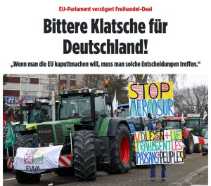 Formal hat das EU-Parlament hauchdünn (334 zu 324 Gegenstimmen) entschieden, das erst vor wenigen Tagen ratifizierte EU-Freihhandelsabkommen mit den wichtigsten Handelspartnern Südamerikas zur Überprüfung an den Europäischen Gerichtshof (EuGH) zu schicken. Damit kann vorerst NICHT die größte Freihandelszone der Welt für mehr als 700 Millionen Menschen entstehen, und die teilweise absurd hohen Zölle (u.a. auf deutsche Autos) bleiben weiter in Kraft. Via bild.de