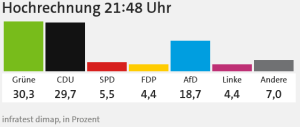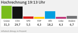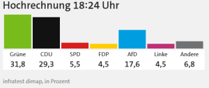 Damit deutet sich ein sehr knappes Rennen zwischen Grünen und CDU an. Entscheidend wird sein, wie sich die Zahlen in den Hochrechnungen im Laufe des Abends entwickeln.