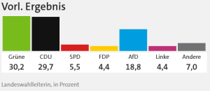 Grüne: ~30,2 % – CDU: ~29,7 % – AfD: ~18,8 – SPD: ~5,5 % – FDP: ~4,4 % – Linke: ~4,4 /