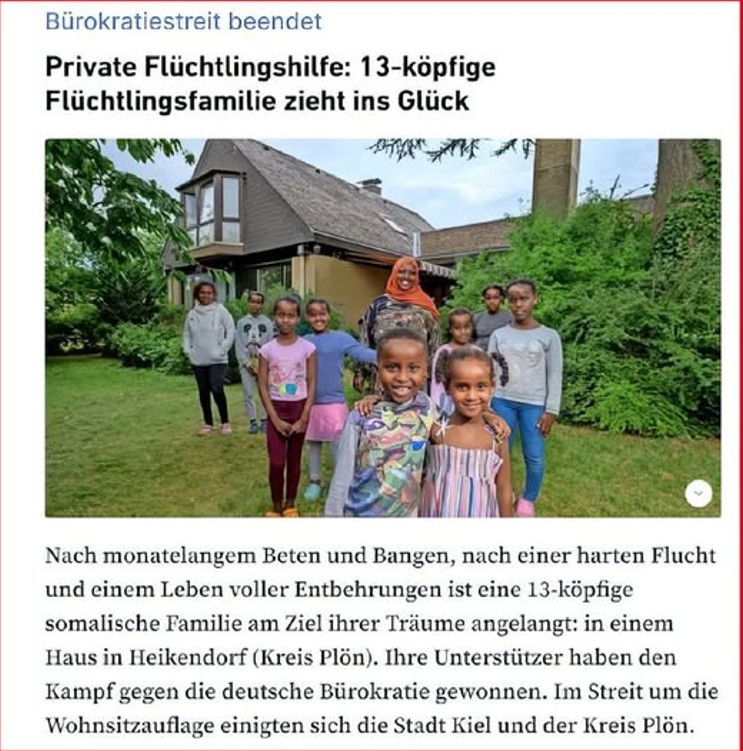 Rodzina z Somalii licząca 13 osób, w której najstarsza córka jest już matką, rzekomo „uciekła” do Niemiec przed bijącym mężem i szybko otrzymała azyl. Pod tytułem „Prywatna pomoc dla uchodźców: 13-osobowa rodzina uchodźców osiągnęła szczęście” historia została „entuzjastycznie” przedstawiona przez Kieler Nachrichten. A dalej napisano: