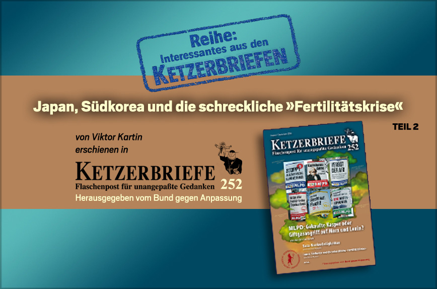 Von VIKTOR KARTIN | Der Zugang zu Kontrazeptiva wird in Japan übrigens erschwert und dadurch die psychologische Hemmschwelle (shikiiga-takai) für Frauen heraufgesetzt. Deshalb sind alle Verhütungsmethoden verschreibungspflichtig, teuer und die Abtreibungsraten entsprechend hoch. Der Entwicklungsverlauf der Fertilitätsraten Südkoreas und Japans ist insofern auch ein Beispiel für Trotzkis Gesetz von der ungleichmäßigen und kombinierten Entwicklung: Nachdem in den 1960er Jahren Verhütungsmittel frei zugänglich gemacht worden waren, sank die Fertilitätsrate Südkoreas von 6,16 Geburten pro Frau (1960) bis 2005 auf ein Sechstel.