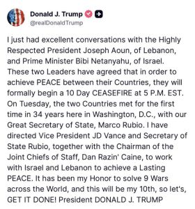 „Ich habe soeben sehr gute Gespräche mit dem hoch angesehenen Präsidenten Joseph Aoun aus dem Libanon sowie mit Premierminister Benjamin Netanyahu aus Israel geführt.“ schrieb er in einem Post auf Truth Social.