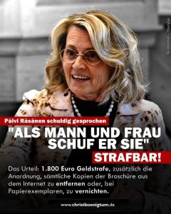 Finnlands Oberster Gerichtshof hat am 26. März 2026 mit 3:2-Stimmen Päivi Räsänen schuldig gesprochen. Die ehemalige Innenministerin, Ärztin und Mutter von fünf Kindern hatte 2004 — vor über zwanzig Jahren — gemeinsam mit dem lutherischen Bischof Juhana Pohjola eine Broschüre verfasst.