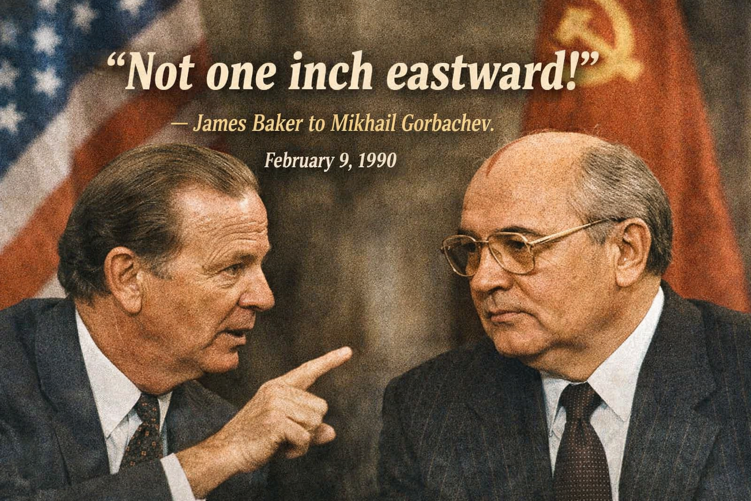 In diesem Zusammenhang darf daran erinnert werden, dass der Westen Russland nach Auflösung des Warschauer-Paktes versprach, die NATO nicht Richtung Russland ausbreiten zu beabsichtigen. Die bekannteste Quelle ist ein Gespräch vom 9. Februar 1990 zwischen dem damaligen US-Außenminister James Baker und dem sowjetischen Staatschef Michail Gorbatschow. Dabei sagte Baker laut Gesprächsprotokoll: “not one inch eastward” („keinen Zoll weiter nach Osten“).